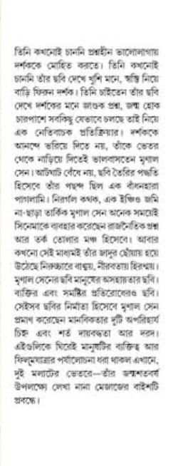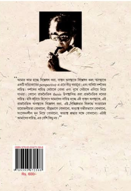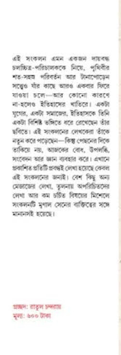 তিনি কখনোই চাননি প্রশ্নহীন ভালোলাগায় দর্শককে মোহিত করতে। তিনি কখনোই চাননি তাঁর ছবি দেখে খুশি মনে, স্বস্তি নিয়ে বাড়ি ফিরুন দর্শক। তিনি চাইতেন তাঁর ছবি দেখে দর্শকের মনে জাগুক প্রশ্ন, জন্ম হোক চারপাশে সবকিছু যেভাবে চলছে তাই নিয়ে এক নেতিবাচক প্রতিক্রিয়ার। দর্শককে আনন্দে ভরিয়ে দিতে নয়, তাঁকে ভেতর থেকে নাড়িয়ে দিতেই ভালবাসতেন মৃণাল সেন। আটঘাট বেঁধে নয়, ছবি তৈরির পদ্ধতি হিসেবে তাঁর পছন্দ ছিল এক বাঁধনহারা পাগলামি। নিরর্গল কথাক, এক ইঞ্চিও জমি না-ছাড়া তার্কিক মৃণাল সেন অনেক সময়েই সিনেমাকে ব্যবহার করেছেন রাজনৈতিক প্রশ্ন আর তর্ক তোলার মঞ্চ হিসেবে। আবার কখনো সেই মাধ্যমই তাঁর জাদুর ছোঁয়ায় হয়ে উঠেছে নিরুচ্চারে বাশ্ময়, নীরবতায় হিরন্মায়। মৃণাল সেনের ছবি মানুষের অসহায়তার ছবি। ব্যক্তির এবং সমষ্টির প্রতিরোধেরও ছবি। সেইসব ছবির নির্মাতা হিসেবে মৃণাল সেন প্রমাণ করেছেন মানবিকতার দুটি অপরিহার্য চিহ্ন এবং শর্ত দায়বদ্ধতা আর দরদ। এইগুলিকে ঘিরেই মানুষটির ব্যক্তিত্ব আর ফিল্মযাত্রার পর্যালোচনা ধরা থাকল এখানে, দুই মলাটের ভেতরে-তাঁর জন্মশতবর্ষ উপলক্ষ্যে লেখা নানা মেজাজের বাইশটি প্রবন্ধে।