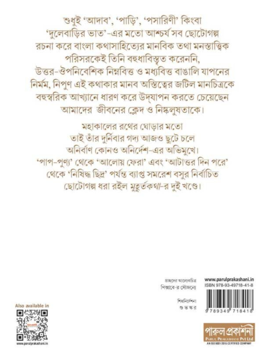 মহাকালের রথের ঘোড়ার মতো তাই তাঁর দুর্নিবার গদ্য আজও ছুটে চলে অনির্বাণ কোনও অনির্দেশ-এর অভিমুখে। 'পাপ-পুণ্য' থেকে 'আলোয় ফেরা' এবং 'আটাত্তর দিন পরে' থেকে 'নিষিদ্ধ ছিদ্র' পর্যন্ত ব্যাপ্ত সমরেশ বসুর নির্বাচিত ছোটোগল্প ধরা রইল মুহূর্তকথা-র দুই খণ্ডে।