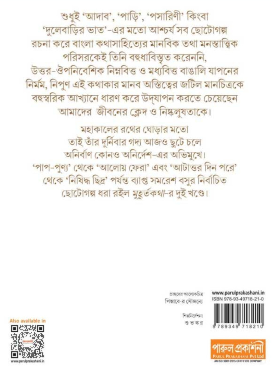 মহাকালের রথের ঘোড়ার মতো তাই তাঁর দুর্নিবার গদ্য আজও ছুটে চলে অনির্বাণ কোনও অনির্দেশ-এর অভিমুখে। 'পাপ-পুণ্য' থেকে 'আলোয় ফেরা' এবং 'আটাত্তর দিন পরে' থেকে 'নিষিদ্ধ ছিদ্র' পর্যন্ত ব্যাপ্ত সমরেশ বসুর নির্বাচিত ছোটোগল্প ধরা রইল মুহূর্তকথা-র দুই খণ্ডে।