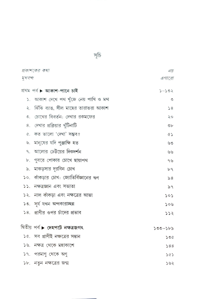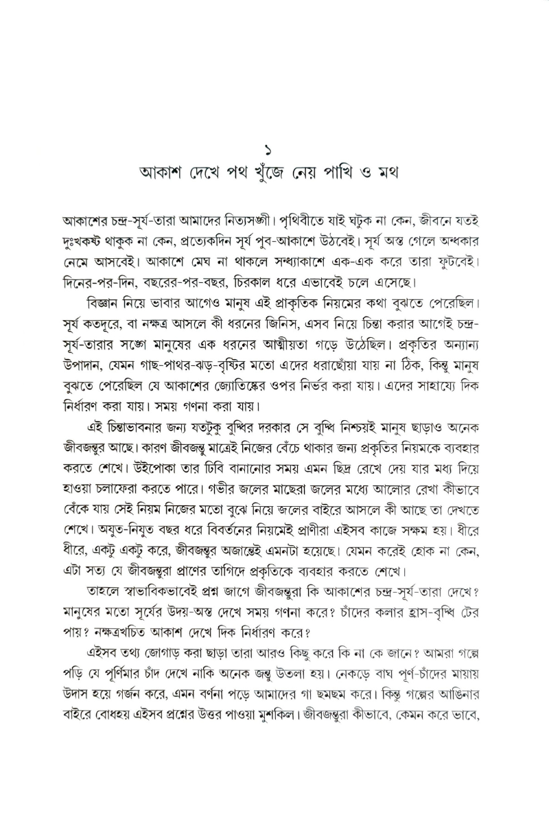 নক্ষত্রজগৎ আর পৃথিবীর প্রাণীজগত—দুই জগৎ কি সত্যিই এত আলাদা? গ্রন্থটিতে জানা যাবে, আকাশের তারা কীভাবে পথ দেখায় গুবরে পোকা, সীলমাছ বা পরিযায়ী পাখিদের। চাঁদের আলো কীভাবে প্রাণীদের আচরণ বদলায়। প্রাণের জন্য দরকারি উপাদান সবই তো নক্ষত্রের ভিতরেই তৈরি। আমরা সবাই নক্ষত্রের সন্তান।