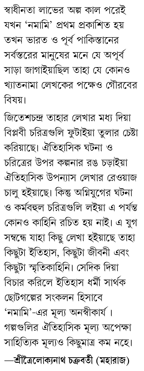 জিতেশচন্দ্র তাহার লেখার মধ্য দিয়া বিপ্লবী চরিত্রগুলি ফুটাইয়া তুলার চেষ্টা করিয়াছে। ঐতিহাসিক ঘটনা ও চরিত্রের উপর কল্পনার রঙ চড়াইয়া ঐতিহাসিক উপন্যাস লেখার রেওয়াজ চালু হইয়াছে। কিন্তু অগ্নিযুগের ঘটনা ও কর্মবহুল চরিত্রগুলি লইয়া এ পর্যন্ত কোনও কাহিনি রচিত হয় নাই। এ যুগ সম্বন্ধে যাহা কিছু লেখা হইয়াছে তাহা কিছুটা ইতিহাস, কিছুটা জীবনী এবং কিছুটা স্মৃতিকাহিনি। সেদিক দিয়া বিচার করিলে ইতিহাস ধর্মী সার্থক ছোটগল্পের সংকলন হিসাবে 'নমামি'-এর মূল্য অনস্বীকার্য।