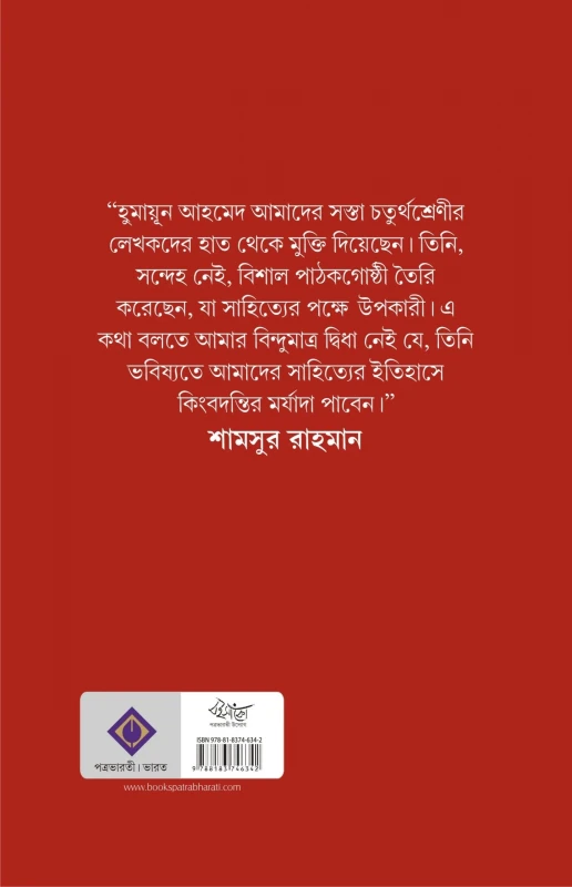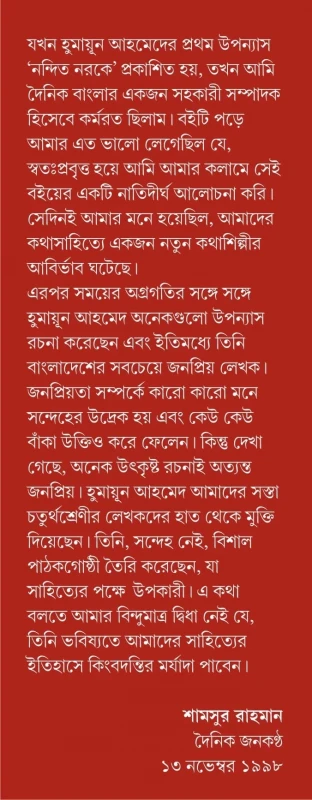 এরপর সময়ের অগ্রগতির সঙ্গে সঙ্গে হুমায়ূন আহমেদ অনেকগুলো উপন্যাস রচনা করেছেন এবং ইতিমধ্যে তিনি বাংলাদেশের সবচেয়ে জনপ্রিয় লেখক ৷ জনপ্রিয়তা সম্পর্কে কারো কারো মনে সন্দেহের উদ্রেক হয় এবং কেউ কেউ বাঁকা উক্তিও করে ফেলেন ৷ কিন্তু দেখা গেছে, অনেক উৎকৃষ্ট রচনাই অত্যন্ত জনপ্রিয়৷ হুমায়ূন আহমেদ আমাদের সস্তা চতুর্থশ্রেণীর লেখকদের হাত থেকে মুক্তি দিয়েছেন ৷ তিনি, সন্দেহ নেই, বিশাল পাঠকগোষ্ঠী তৈরি করেছেন, যা সাহিত্যের পক্ষে উপকারী ৷ এ কথা বলতে আমার বিন্দুমাত্র দ্বিধা নেই যে, তিনি ভবিষ্যতে আমাদের সাহিত্যের ইতিহাসে কিংবদন্তির মর্যাদা পাবেন ৷ ‘