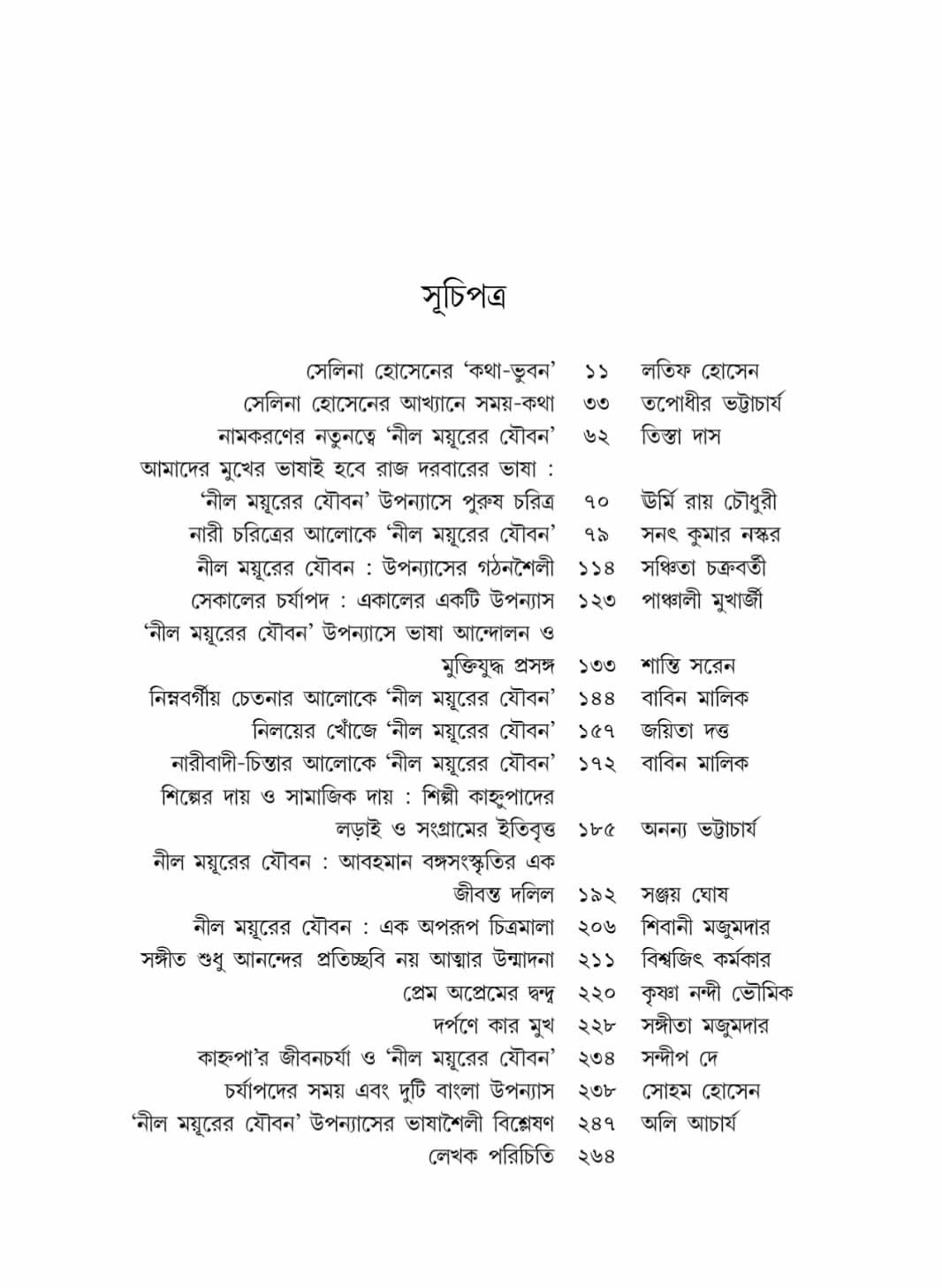 সাম্প্রতিক কালের বাংলা কথাসাহিত্যে যিনি আপন প্রতিভায় পাঠক হৃদয়ে বিরাজমান হয়ে রয়েছেন, তিনি হলেন সেলিনা হোসেন। তাঁর অন্যতম সৃষ্টি 'নীল ময়ূরের যৌবন'। যেখানে সম্মিলন ঘটেছে ১৯৫২-র ভাষা আন্দোলন ও পূর্ব পাকিস্তান থেকে বাংলাদেশ হয়ে ওঠার অতীত ইতিহাস। পাশাপাশি উপন্যাস দর্পণে প্রতিভাত হয়েছে প্রেম, প্রতিবাদ, ঈর্ষা, লড়াই-এর সাথে স্বপ্ন সাফল্যের দ্বন্দ্ব-বিরোধ। আলোচ্য গ্রন্থে উপন্যাসটিকে বিবিধ দৃষ্টিকোণ থেকে আলোকপাত করা হয়েছে। যা পাঠকের আকাঙ্ক্ষা পরিতৃপ্ত করতে সক্ষম হবে।