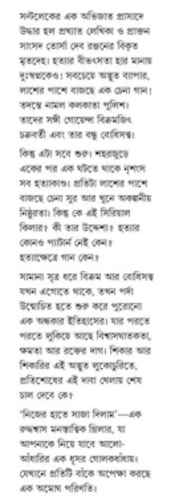 কিন্তু এটা সবে শুরু। শহরজুড়ে একের পর এক ঘটতে থাকে নৃশংস সব হত্যাকাণ্ড। প্রতিটা লাশের পাশে বাজছে চেনা সুর আর খুনে অকল্পনীয় নিষ্ঠুরতা। কিন্তু কে এই সিরিয়াল কিলার? কী তার উদ্দেশ্য? হত্যার কোনও প্যাটার্ন নেই কেন? হত্যাক্ষেত্রে গান কেন?