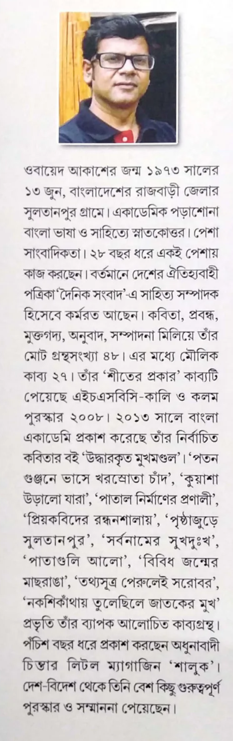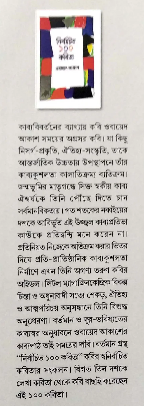 কাব্যবিবর্তনের ব্যাখ্যায় কবি ওবায়েদ আকাশ সময়ের অগ্রসর কবি। যা কিছু নিসর্গ-প্রকৃতি, ঐতিহ্য-সংস্কৃতি, তাকে আন্তর্জাতিক উচ্চতায় উপস্থাপনে তাঁর কাব্যকুশলতা কালাতিক্রম্য ব্যতিক্রম। জন্মভূমির মাতৃগন্ধে সিক্ত স্বকীয় কাব্য ঐশ্বর্যকে তিনি পৌঁছে দিতে চান সর্বমানবিকতায়। গত শতকের নব্বইয়ের দশকে আবির্ভূত এই উজ্জ্বল কাব্যপ্রতিভা কাউকে প্রতিদ্বন্দি মনে করেন না। প্রতিনিয়ত নিজেকে অতিক্রম করার ভিতর দিয়ে প্রতি-প্রাতিষ্ঠানিক কাব্যকুশলতা নির্মাণে এখন তিনি অগণ্য তরুণ কবির আইডল। লিটল ম্যাগাজিনকেন্দ্রিক বিকল্প চিন্তা ও অধুনাবাদী সত্যে শেকড়, ঐতিহ্য ও আত্মপরিচয় অনুসন্ধানে তিনি বিশুদ্ধ অনুপ্রেরণা। বর্তমান ও দূর-ভবিষ্যতের কাব্যস্বর অনুধাবনে ওবায়েদ আকাশের কাব্যপাঠ তাই সময়ের দাবি। বর্তমান গ্রন্থ "নির্বাচিত ১০০ কবিতা" কবির স্বনির্বাচিত কবিতার সংকলন। বিগত তিন দশকে লেখা কবিতা থেকে কবি বাছাই করেছেন এই ১০০ কবিতা।