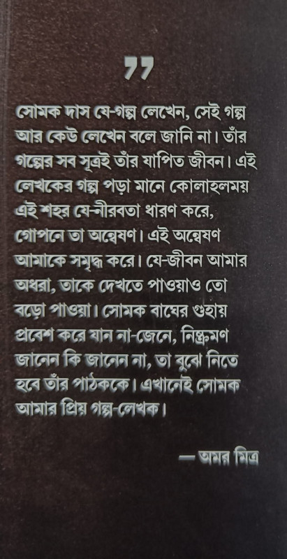 “সোমক দাস যে-গল্প লেখেন, সেই গল্প আর কেউ লেখেন বলে জানি না। তাঁর গল্পের সব সূত্রই তাঁর যাপিত জীবন। এই লেখকের গল্প পড়া মানে কোলাহলময় এই শহর যে-নীরবতা ধারণ করে, গোপনে তা অন্বেষণ। এই অন্বেষণ আমাকে সমৃদ্ধ করে। যে-জীবন আমার অধরা, তাকে দেখতে পাওয়াও তো বড়ো পাওয়া। সোমক বাঘের গুহায় প্রবেশ করে যান না-জেনে, নিষ্ক্রমণ জানেন কি জানেন না, তা বুঝে নিতে হবে তাঁর পাঠককে। এখানেই সোমক আমার প্রিয় গল্প-লেখক।" ---অমর মিত্র