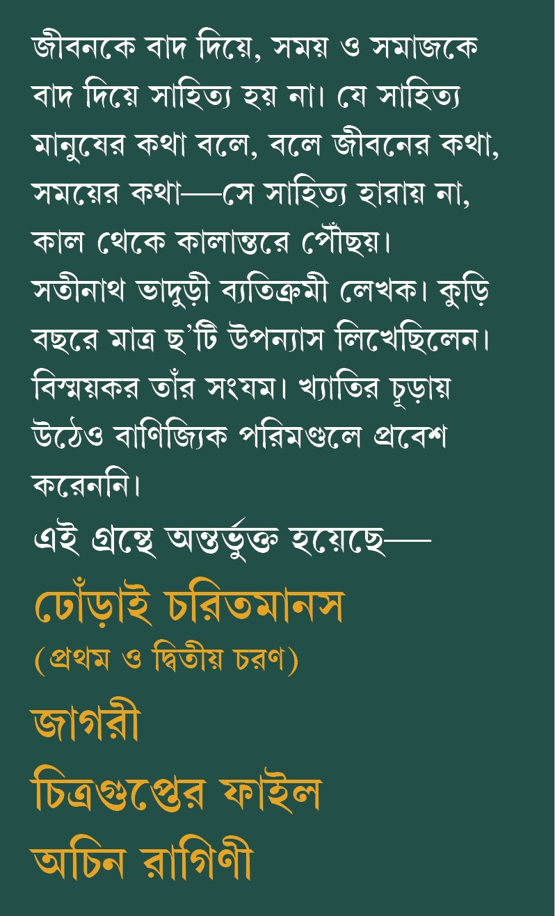 সতীনাথ ভাদুড়ী ব্যতিক্রমী লেখক। কুড়ি বছরে মাত্র ছ'টি উপন্যাস লিখেছিলেন। বিস্ময়কর তাঁর সংযম। খ্যাতির চূড়ায় উঠেও বাণিজ্যিক পরিমণ্ডলে প্রবেশ করেননি।