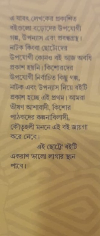 এ যাবৎ লেখকের প্রকাশিত বইগুলো বড়োদের উপযোগী গল্প, উপন্যাস এবং প্রবন্ধগ্রন্থ। নাটক কিংবা ছোটোদের উপযোগী কোনও বই আজ অবধি প্রকাশ হয়নি। কিশোরদের উপযোগী নির্বাচিত কিছু গল্প, নাটক এবং উপন্যাস নিয়ে বইটি প্রকাশ হচ্ছে এই প্রথম। কিশোর পাঠকদের কল্পনাবিলাসী, কৌতূহলী মননে