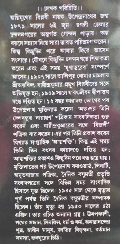 অগ্নিযুগের বিপ্লবী নায়ক উপেন্দ্রনাথের জন্ম ১৮৭৯ সালের ৬ই জুন। হুগলী জেলার চন্দননগরের অন্তর্গত গোন্দল পাড়ায়। অল্প বয়সে সন্ন্যাস নিয়ে সারা ভারত পরিভ্রমণ করেন। কিন্তু কিছুদিন পরে আবার ফিরে আসেন সংসারে। যৌবনে কিছুদিন চন্দননগরে শিক্ষকতা করেন এবং এই সময় 'যুগান্তরের' সংস্পর্শে আসেন। ১৯০৭ সালে আলিপুর বোমার মামলায় শ্রীঅরবিন্দ, বারীন্দ্রকুমার প্রমুখ বিপ্লবীদের সঙ্গে অভিযুক্ত হন; ১৯০৯ সালে যাবৎজীবন দ্বীপান্তর দণ্ডে দণ্ডিত হন। ১২ বছর কারাদণ্ড ভোগের পর উপেন্দ্রনাথ মুক্তিলাভ করেন। অতঃপর তিনি দেশবন্ধুর 'নারায়ণ' পত্রিকায় সাংবাদিকতা শুরু করেন এবং বারীন্দ্রকুমারের সঙ্গে 'বিজলী' পত্রিকা বার করেন। এর পর তিনি প্রকাশ করেন বিখ্যাত সাপ্তাহিক 'আত্মশক্তি'। কিন্তু এই সময় তিনি তিন বৎসর কারাদণ্ডে দণ্ডিত হন; আত্মশক্তির প্রকাশও কিছুদিন পরে বন্ধ হয়ে যায়। মুক্তিলাভের পর উপেন্দ্রনাথ ফরওয়ার্ড, লিবার্টি, অমৃতবাজার পত্রিকা, দৈনিক বসুমতী প্রভৃতি সংবাদপত্রের সঙ্গে বিভিন্ন সময় সাংবাদিক হিসাবে যুক্ত ছিলেন। ১৯৪৫ সাল থেকে মৃত্যুর পূর্ব পর্যন্ত তিনি দৈনিক বসুমতীর সম্পাদক ছিলেন। তাঁর মৃত্যু হয় ১৯৫০ সালের ৪ঠা এপ্রিল। তার রচিত অন্যান্য গ্রন্থঃ ঊনপঞ্চাশী, পথের সন্ধান, সিনফিন, ধর্ম ও কর্ম, অনন্তানন্দের পুত্র, স্বাধীন মানুষ, জাতির বিড়ম্বনা, বর্তমান সমস্যা, ভবঘুরের চিঠি।