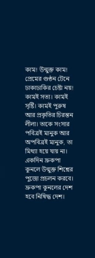 কোনো চিহ্ন ফিহ্নের মিথ্যে গল্প ফাঁদা নয়! লজ্জা জয় করে উদাত্ত কণ্ঠে বলো, শিশ্ন! প্রেমের গুণ্ঠন টেনে ঢাকাঢাকির চেষ্টা নয়! কাম! উন্মুক্ত কাম! তাকে সংসার পবিত্রই মানুক আর অপবিত্রই মানুক, তা মিথ্যা হয়ে যায় না। কামই সত্য। কামই সৃষ্টি। কামই পুরুষ আর প্রকৃতির চিরন্তন লীলা। একদিন দ্রুকপা কুনলে উন্মুক্ত শিশ্নের পুজো প্রচলন করবে। দ্রুকপা কুনলের দেশ হবে নিষিদ্ধ দেশ।