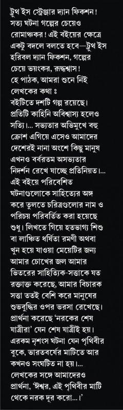 ট্রুথ ইস স্ট্রেঞ্জার দ্যান ফিকশন ! সত্য ঘটনা গল্পের চেয়েও রোমাঞ্চকর ! এই বইয়ের ক্ষেত্রে একটু বদলে বলতে হবে — ট্রুথ ইস হরিবল দ্যান ফিকশন, গল্পের চেয়ে ভয়ংকর, রূদ্ধশ্বাস !
