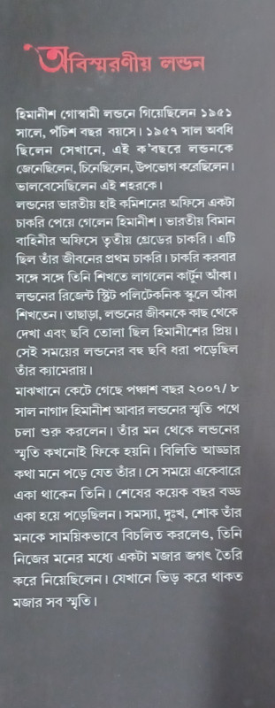 ১৯৫১ সালে বিলেত যাত্রা, এবং সেখানেই জীবনের প্রথম চাকরি। লন্ডন শহরটাকে হিমানীশ গোস্বামী খুব কাছ থেকে দেখেছেন, আর ক্যামেরাতেও ধরে রেখেছিলেন নানা মুহূর্ত। এই শহরে যে সব মানুষজনদের সঙ্গে তাঁর ছ’বছরের দিনযাপন, তাঁরা স্থায়ী একটা ছাপ ফেলে গিয়েছিলেন হিমানীশের মনে। জীবনের শেষ পর্যায়ে এসে সেই সব টুকরো স্মৃতি আর সযত্নে রক্ষিত সেই সময়কার ছবি, সব আবার ফিরে এসেছে আড্ডার মেজাজে লেখা এই বইটির পৃষ্ঠায়।