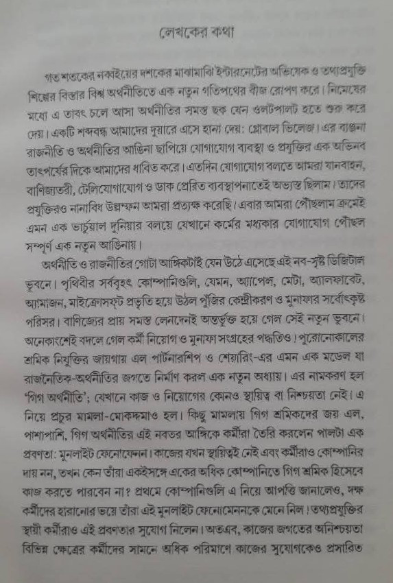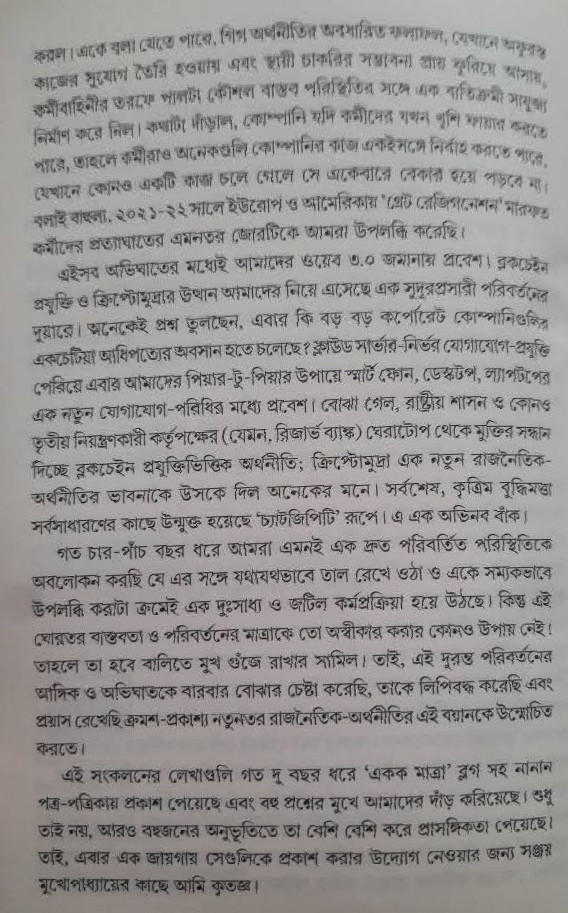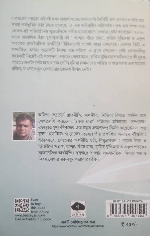 এ বছরের গোড়ায় এই বই যখন প্রকাশ পাচ্ছে তখন চ্যাট জিপিটি এবং ওপেন এ আই প্রায় সমস্ত কর্মভূমির ভার নিতে চলেছে। এ এক অচিন্তনীয় পরিবর্তন। গত এক দশক ধরে লেখক এই পরিবর্তনের সূত্রগুলিকে গভীর মনোযোগে বোঝার চেষ্টা করেছেন। ২০২০ সালে প্রকাশিত তাঁর যুগান্তকারী বই 'আশায় বাঁচে চাষা', কৃত্রিম বুদ্ধিমত্তা ও একুশ শতকের রাজনৈতিক অর্থনীতি' ইতিমধ্যেই যথেষ্ট সাড়া ফেলেছে। এরপর তিনি এ সম্পকিত আরও কয়েকটি নিবন্ধ পত্র-পত্রিকা ও ব্লগে লেখেন। সেই লেখাগুলির কয়েকটি নিয়েই এই সংকলন। পড়লে বোঝা যাবে, কৃত্রিম বুদ্ধিমত্তার অভিঘাতে কী দুরন্ত গতিতে ওলটপালট হয়ে যাচ্ছে গোটা দুনিয়া। আমাদের অস্তিত্ব ও বাস্তবতার এক অমোঘ দলিল, যা থেকে মুখ ফেরানোর কোনও উপায় নেই।