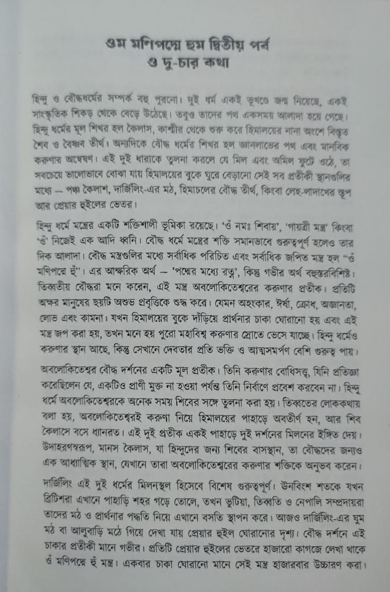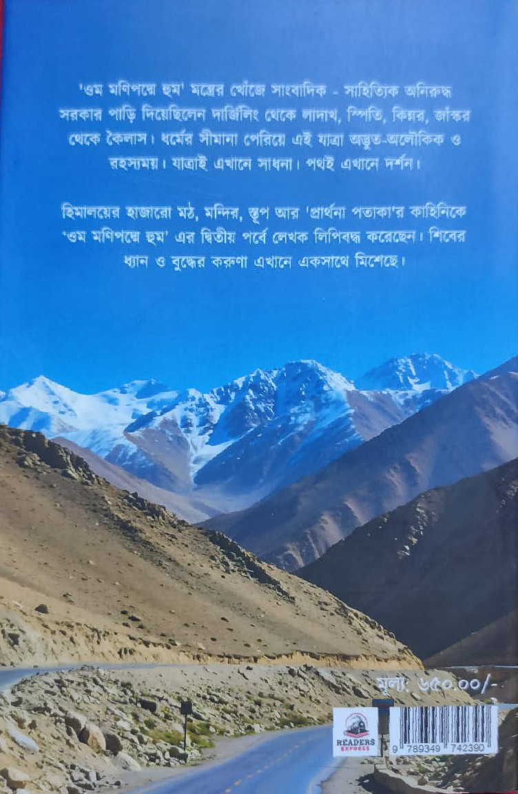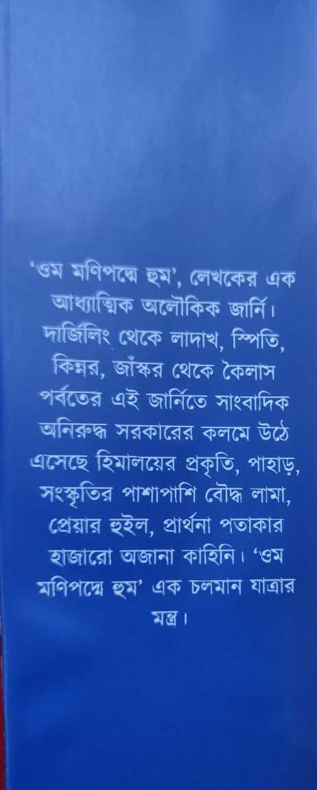 'ওম মণিপদ্মে হুম', লেখকের এক আধ্যাত্মিক অলৌকিক জার্নি। দার্জিলিং থেকে লাদাখ, স্পিতি, কিন্নর, জাঁস্কর থেকে কৈলাস পর্বতের এই জার্নিতে সাংবাদিক অনিরুদ্ধ সরকারের কলমে উঠে এসেছে হিমালয়ের প্রকৃতি, পাহাড়, সংস্কৃতির পাশাপাশি বৌদ্ধ লামা, প্রেয়ার হুইল, প্রার্থনা পতাকার হাজারো অজানা কাহিনি। 'ওম মণিপদ্মে হুম' এক চলমান যাত্রার মন্ত্র।