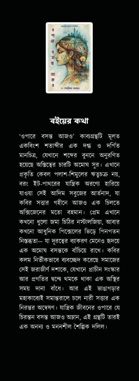 'ওপারে বসন্ত আজও' কাব্যগ্রন্থটি মূলত একবিংশ শতাব্দীর এক দগ্ধ ও দর্পিত মানচিত্র, যেখানে শব্দের বুননে অনুরণিত হয়েছে অস্তিত্বের চারটি অমোঘ সুর। এখানে প্রকৃতি কেবল পলাশ-শিমুলের ঋতুচক্র নয়, বরং ইট-পাথরের যান্ত্রিক অরণ্যে হারিয়ে যাওয়া সেই আদিম সবুজের আর্তনাদ, যা কবির সত্তার গহীনে আজও এক চিলতে অক্সিজেনের মতো বহমান। প্রেম এখানে কখনো ধুলো জমা চিঠির নস্টালজিয়া, আবার কখনো আধুনিক পিক্সেলের ভিড়ে পিনপতন নিস্তব্ধতা- যা দূরত্বের ব্যাকরণ মেনেও হৃদয়ে এক অমোঘ বসন্তকে বাঁচিয়ে রাখে। কবির কলম নির্ভীকভাবে ব্যবচ্ছেদ করেছে সমাজের সেই জরাজীর্ণ দশাকে, যেখানে প্রাচীন সংস্কার আর প্রগতির দ্বন্দ্বে থমকে থাকা এক অস্থির সময় দানা বাঁধে। আর এই ভাঙাগড়ার মহাকাব্যেই সমান্তরালে চলে নারী সত্তার এক নিরন্তর অন্বেষণ। যান্ত্রিক জীবনের ওপারে যে চিরন্তন বসন্ত আজও অম্লান, এই গ্রন্থটি তারই এক অনন্য ও মননশীল শৈল্পিক দলিল।