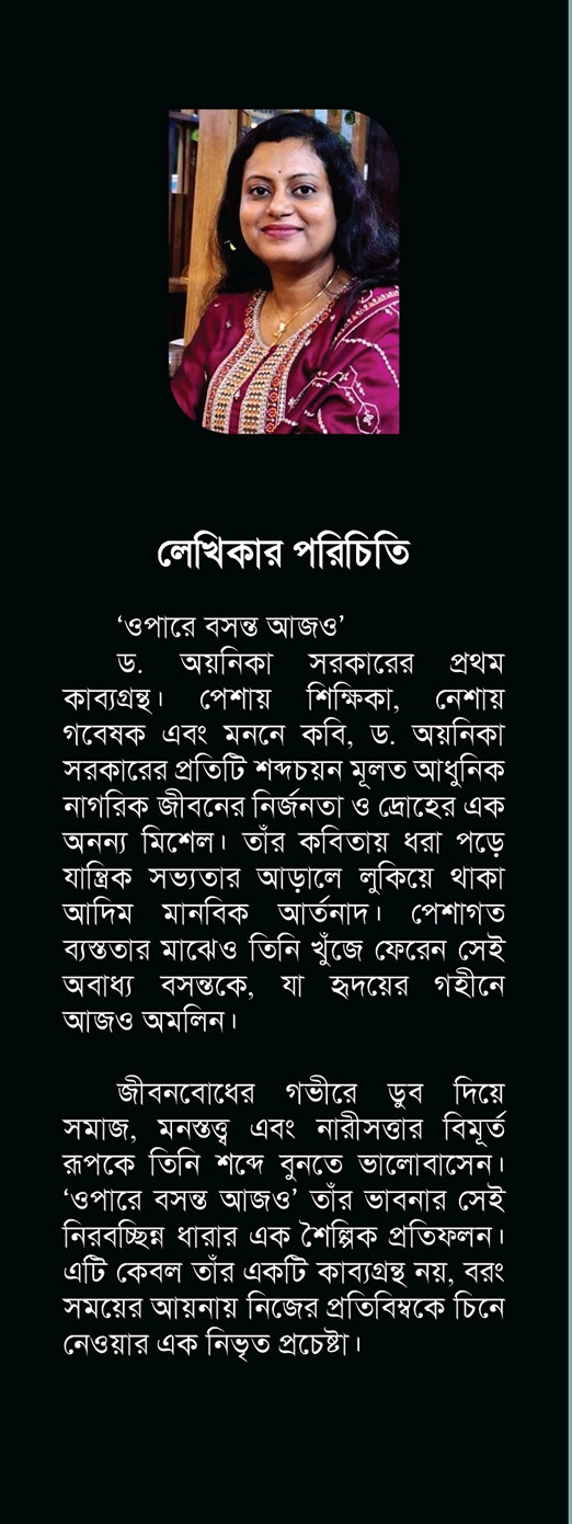 'ওপারে বসন্ত আজও' ড. অয়নিকা সরকারের প্রথম কাব্যগ্রন্থ। পেশায় শিক্ষিকা, নেশায় গবেষক এবং মননে কবি, ড. অয়নিকা সরকারের প্রতিটি শব্দচয়ন মূলত আধুনিক নাগরিক জীবনের নির্জনতা ও দ্রোহের এক অনন্য মিশেল। তাঁর কবিতায় ধরা পড়ে যান্ত্রিক সভ্যতার আড়ালে লুকিয়ে থাকা আদিম মানবিক আর্তনাদ। পেশাগত ব্যস্ততার মাঝেও তিনি খুঁজে ফেরেন সেই অবাধ্য বসন্তকে, যা হৃদয়ের গহীনে আজও অমলিন।