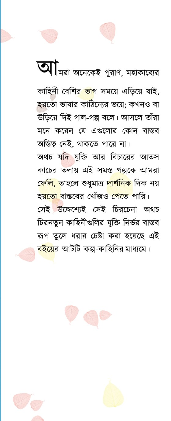 সেই উদ্দেশ্যেই সেই চিরচেনা অথচ চিরনতুন কাহিনীগুলির যুক্তি নির্ভর বাস্তব রূপ তুলে ধরার চেষ্টা করা হয়েছে এই বইয়ের আটটি কল্প-কাহিনির মাধ্যমে।