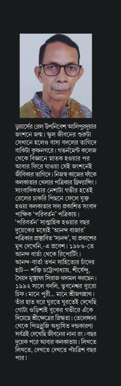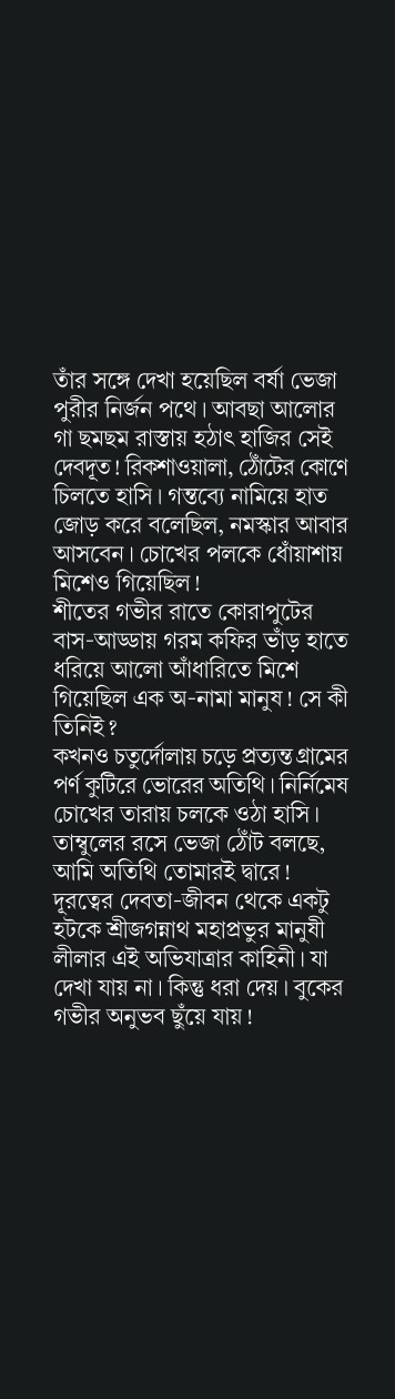 তাঁর সঙ্গে দেখা হয়েছিল বর্ষাভেজা পুরীর নির্জন পথে। আবছা আলোর গা ছমছমে রাস্তায় হঠাৎ হাজির সেই দেবদূত! রিকশাওয়ালা, ঠোঁটের কোণে এক চিলতে হাসি। গন্তব্যে নামিয়ে হাতজোড় করে বলেছিল, নমস্কার আবার আসবেন। চোখের পলকে ধোঁয়াশায় মিশেও গিয়েছিল! শীতের গভীর রাতে কোরাপুটের বাস-আড্ডায় গরম কফির ভাঁড় হাতে ধরিয়ে আলো-আঁধারিতে মিশে গিয়েছিল এক অ-নামা মানুষ! সে কি তিনিই? দূরত্বের দেবতা-জীবন থেকে একটু হটকে জগন্নাথদেবের মানুষী অভিযাত্রার কাহিনী এই বই।