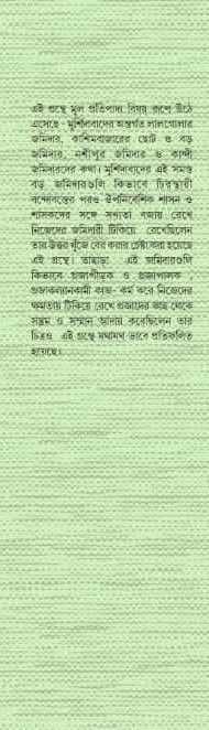 চিরস্থায়ী বন্দোরস্থ কিভাবে গ্যংলাদেশের ভূস্বামী ও চিরাচরিত জামিয়্যা শ্রেণী এবং কৃষক সমাজের উপর, কী ধরনের প্রভাব বিস্তার করে ছিল সে কথা আমাদের অজানা নয়। কিন্তু এই চিরস্থায়ী বন্দোবস্ত মুর্শিদাবাদের জমিদার শ্রেনীকে কতটা প্রভাবিত করেছিল, কতটা জামাতা প্রদান করেছিল এবং সেই সঙ্গে ছোট ছোট জমিদারদের জমিদারী কেড়ে নিয়ে কিভাবে এক নতুন জমিদার শ্রেনীর সৃষ্টি করেছিল তা নিয়ে খুব বেশি আলোচনা যেমন হয়নি, তেমনি ঐতিহাসিক গবেষণাও তুলনামূলকভাবে এম। বিশেষকরে এই প্রশ্নে মূল প্রতিপাদ্য বিষয় রূপে উঠে এসেছে মুর্শিদাবাদের অন্তর্গত লালগোলার ক্রমিনার, কাশিমবাজাবের ছোট ও বড় জমিদার, নশীপুর জমিদার ও তাপী জমিলারদের করা মুশিদায়েরের এই সমাজ বড় জমিদারগুলি বিভাবে চিরস্থায়ী বন্দোবস্তের প্যার উপনিবেশিক শাসন ও শাসকদের সঙ্গে সখ্যতা বজায় রেখে নিজেদের জমিলরী টিকিয়ে রেখেছিলেন তার উত্তর খুঁজে বের করার চেষ্টা করা হয়েছে এই গ্রন্থে। তাছাড়া এই জমিদার গুলি লিভাবে প্রজাপীড়ক ও প্রজাপালক, প্রজাগপ্ল্যানকামী কাজ কর্ম করে নিজেদের ক্ষমতায় টিকিয়ে রেখে প্রজাদের কাছ দেকে সম্ভ্রম ও সম্মান আদায় করেছিলেন তার চিত্রও এই গ্রন্থে স্থ যথাযথ ভাবে প্রতিফলিত হয়েছে। মুর্শিদাবাদের এই জমিদার শ্রেণীর মধ্যে স্ববিরোধিতা মিল, কখন্যে তাঁরা ব্রিটিশদের একান্ত অনুগত আবার কখনো তাঁরা ব্রিটিশ বিরোধী, কখনো তাঁরা স্বাধীনতাকামী, একই অসে বহরাণ, প্রস্তুতি নিয়েই এই গ্রন্থের আলোচনা।