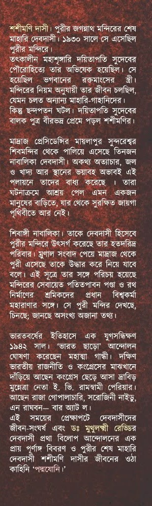 এই সময়ের প্রেক্ষাপটে দেবদাসীদের জীবন-সংঘর্ষ এবং ডঃ মুথুলক্ষ্মী রেড্ডির দেবদাসী প্রথা বিলোপ আন্দোলনের এক প্রায় পূর্ণাঙ্গ বিবরণ ও পুরীর শেষ মাহারি দেবদাসী শশীমণি দাসীর জীবনের কাহিনি