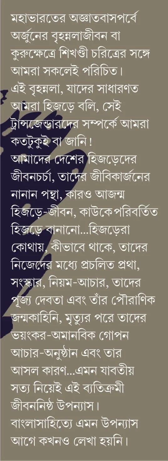 আমাদের দেশের হিজড়েদের জীবনচর্চা, তাদের জীবিকার্জনের নানান পন্থা, কারও আজন্ম হিজড়ে-জীবন, কাউকে পরিবর্তিত হিজড়ে বানানো…হিজড়েরা কোথায়, কীভাবে থাকে, তাদের নিজেদের মধ্যে প্রচলিত প্রথা, সংস্কার, নিয়ম-আচার, তাদের পূজ্য দেবতা এবং তাঁর পৌরাণিক জন্মকাহিনি, মৃত্যুর পরে তাদের ভয়ংকর-অমানবিক গোপন আচার-অনুষ্ঠান এবং তার আসল কারণ…এমন যাবতীয় সত্য নিয়েই এই ব্যতিক্রমী জীবননিষ্ঠ উপন্যাস ৷
