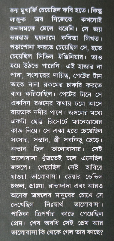 জয় মুখার্জি চেয়েছিল কবি হতে। কিন্তু লাজুক জয় নিজেকে কখনোই জনসমক্ষে মেলে ধরেনি। সে জয় ভরদ্বাজ ছদ্মনামে কবিতা লিখত। পড়াশোনা করতে চেয়েছিল সে, হতে চেয়েছিল সিভিল ইঞ্জিনিয়ার। তাও হয়ে উঠতে পারেনি। এই হাজার না পারা, সংসারের দায়িত্ব, পেটের টান তাকে নানা রকমের চাকরি করতে বাধ্য করিয়েছিল। পেটের টানে সে একদিন রঞ্জনের কথায় চলে আসে রায়ডাক নদীর পাশে। জঙ্গলের মধ্যে একটা ছোট্ট রিসোর্টে ম্যানেজারের কাজ নিয়ে। সে একা হতে চেয়েছিল সংসার, সন্তান, স্ত্রী সবকিছু ছেড়ে। অভাব ছিল ভালোবাসার। সেই ভালোবাসা খুঁজতেই চলে এসেছিল জঙ্গলে। পেয়েছিল সেই হারিয়ে যাওয়া ভালোবাসা। ডেয়ার ডেভিল চঞ্চল, প্রাঞ্জয়, রাভাদাদা এবং আরও অনেক জঙ্গলের মানুষের চোখে সে দেখেছিল নিঃস্বার্থ ভালোবাসা। পাঠিকা ত্রিপর্ণার কাছে পেয়েছিল প্রেম। শেষ অবধি সেই প্রেম আর ভালোবাসা কি থেকে গেল তার কাছে?
