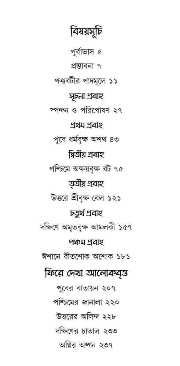 অশত্থ, বট, বেল, আমলকী, অশোক -এই পাঁচটি ধর্মীয় বৃক্ষের সমাবেশ পঞ্চবটী। ঐতিহাসিক, পুরাতাত্ত্বিক, পৌরাণিক, আধ্যাত্মিক, লৌকিক, আয়ুর্বেদিক ইত্যাদি নানা দৃষ্টিকোণে পঞ্চবটীকে জানার নিরলস প্রয়াস রয়েছে আলোচ্য গ্রন্থটিতে।