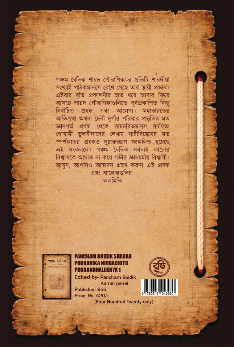 পঞ্চম বৈদিক শারদ পৌরাণিকা-র প্রতিটি শারদীয়া সংখ্যাই পাঠকমানসে রেখে গেছে তার স্থায়ী প্রভাব। এইবার বৃতি প্রকাশনীর হাত ধরে আবার ফিরে আসছে শারদ পৌরাণিকাগুলিতে পূর্বপ্রকাশিত কিছু নির্বাচিত প্রবন্ধ এবং আলেখ্য। মহাভারতের জাতিপ্রথা অথবা দেবী দুর্গার পরিবার প্রভৃতির মত জ্ঞানগর্ভ প্রবন্ধ থেকে রামচরিতমানস রচয়িতা গোস্বামী তুলসীদাসের লেখায় নারীবিদ্বেষের মত স্পর্শকাতর প্রবন্ধও সুচারুরূপে সংকলিত হয়েছে এই সংকলনে। পঞ্চম বৈদিক সর্বদাই কারোর বিশ্বাসকে আঘাত না করে গভীর জ্ঞানচর্চায় বিশ্বাসী। আসুন, আপনিও আস্বাদন গ্রহণ করুন এই প্রবন্ধ এবং আলেখ্যগুলির।