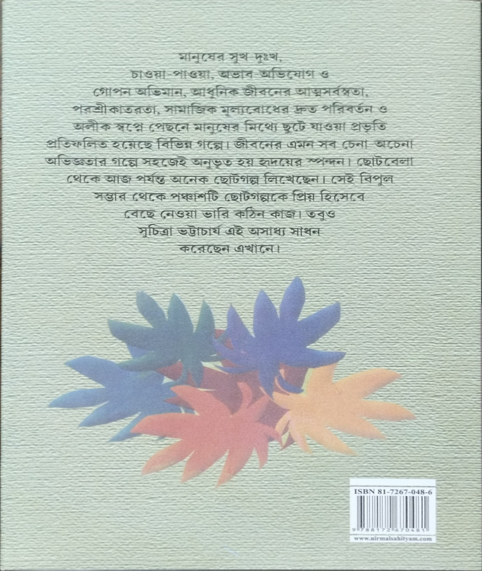 'কম বয়সের লেখায় আবেগ ছিল বেশি। ক্রমশই সেই আবেগ জারিত হয়েছে উপলব্ধি আর অভিজ্ঞতায়।' নিজের লেখালিখি সম্বন্ধে এমনই অকপট স্বীকারোক্তি একালের জনপ্রিয় লেখিকা সুচিত্রা ভট্টাচার্যর। ছোটবেলা থেকে আজ পর্যন্ত তিনি অনেক ছোটগল্প লিখেছেন। সেই বিপুল সম্ভার থেকে পঞ্চাশটি ছোটগল্পকে প্রিয় হিসেবে বেছে নেওয়া ভারি কঠিন কাজ। তবু তিনি এই অসাধ্য সাধন করেছেন এখানে। সংকলনের কোনও গল্পের বিষয় হয়ে উঠেছে মানুষের সুখ-দুঃখ, চাওয়া-পাওয়া, অভাব-অভিযোগ ও গোপন অভিমান। অন্য গল্পে তেমনি প্রতিফলিত হয়েছে আধুনিক জীবনের আত্মসর্বস্বতা, পরশ্রীকাতরতা, সামাজিক মূল্যবোধের দ্রুত পরিবর্তন ও অলীক স্বপ্নের পেছনে মানুষের মিথ্যে ছুটে যাওয়া। জীবনের এমন সব চেনা-অচেনা অভিজ্ঞাতার গল্পে সহজেই অনুভূত হয় হৃদয়ের স্পন্দন। এখানেই লেখনীর গুণ, লেখিকার জনপ্রিয়তার রহস্য।