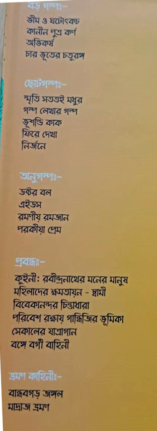 ভারতীয় পুরাণের নবনির্মাণে দিলীপবাবুর কব্জির জোর টের পাওয়া যায় ‘ভীম। ও ঘটোৎকচ’ গদ্যের বিন্যাসে। নাটকীয়তা আর গল্পরসের গাঁটছড়া অনবদ্য। স্নেহধন্যা কুইনীর সঙ্গে রবীন্দ্রনাথের সম্পর্ক যতটা স্পষ্ট, অস্পষ্টতা তার চেয়ে অনেক বেশি। এ এক নতুন আলাে।।