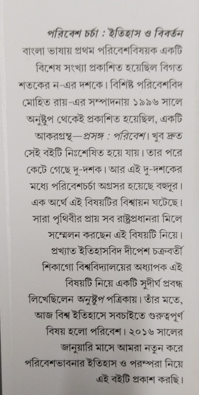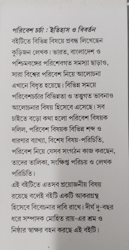 বইটিতে বিভিন্ন বিষয়ে প্রবন্ধ লিখেছেন কুড়িজন লেখক। ভারত, বাংলাদেশ ও পশ্চিমবঙ্গের পরিশেবগত সমস্যা ছাড়াও, সারা বিশ্বের পরিবেশ নিয়ে আলোচনা এখানে বিধৃত হয়েছে। বিভিন্ন সময়ে পরিবেশচর্চার বিভিন্নতা ও তত্ত্বগত ভাবনাও আলোচনার বিষয় হিসেবে এসেছে। সব চাইতে বড়ো কথা হলো পরিবেশ বিষয়ক দলিল, পরিবেশ বিষয়ক বিভিন্ন শব্দ ও ধারণার ব্যাখ্যা, বিশেষ বিষয়-পরিচিতি, পরিবেশ নিয়ে যেসব সংগঠন কাজ করছেন, তাদের তালিকা, সংক্ষিপ্ত পরিচয় ও লেখক পরিচিতি।