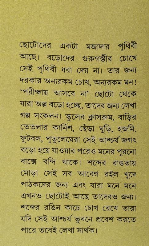 ছোটোদের একটা মজাদার পৃথিবী আছে। বড়োদের গুরুগম্ভীর চোখে সেই পৃথিবী ধরা দেয় না। তার জন্য দরকার অন্যরকম চোখ, অন্যরকম মন! 'পরীক্ষায় আসবে না' ছোটো থেকে যারা অল্প বড়ো হচ্ছে, তাদের জন্য লেখা গল্প সংকলন। স্কুলের ক্লাসরুম, বাড়ির তেতলার কার্নিশ, ছেঁড়া ঘুড়ি, হজমি, ফুটবল, পুতুলেঘেরা সেই আশ্চর্য জগৎ বড়ো হয়ে যাওয়ার পরেও মনের পুরনো বাক্সে বন্দি থাকে। শব্দের রাঙতায় মোড়া সেই সব আবেগ রইল খুদে পাঠকদের জন্য এবং যারা মনে মনে এখনও ছোটোই আছে তাদেরও জন্য। শব্দের রঙিন কাচে চোখ রেখে তারা যদি সেই আশ্চর্য ভুবনে প্রবেশ করতে পারে তবেই লেখা সার্থক।
