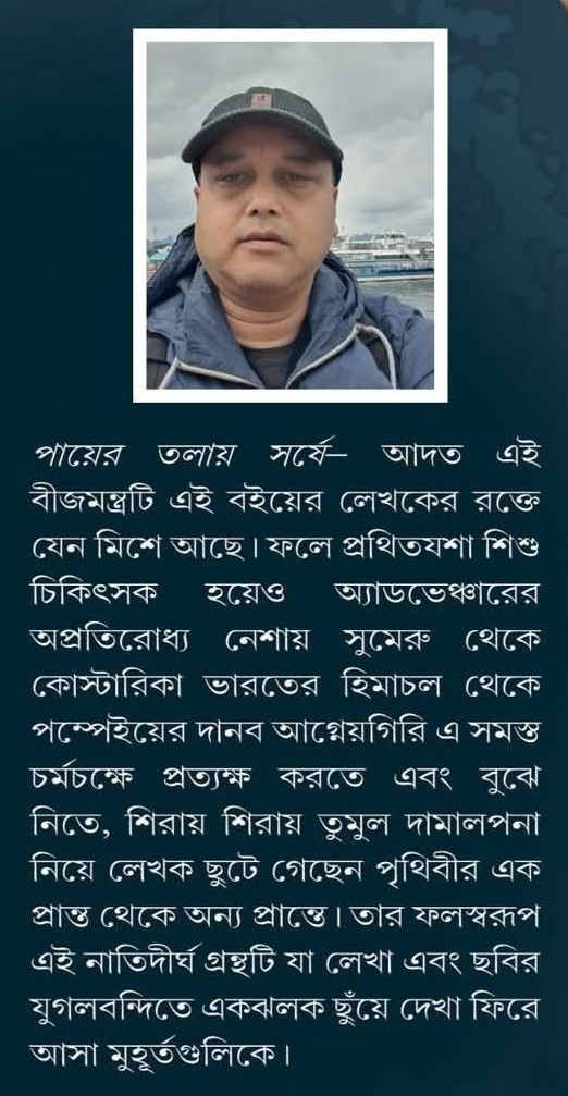 পায়ের তলায় সর্ষে- আদত এই বীজমন্ত্রটি এই বইয়ের লেখকের রক্তে যেন মিশে আছে। ফলে প্রথিতযশা শিশু চিকিৎসক হয়েও অ্যাডভেঞ্চারের অপ্রতিরোধ্য নেশায় সুমেরু থেকে কোস্টারিকা ভারতের হিমাচল থেকে পম্পেইয়ের দানব আগ্নেয়গিরি এ সমস্ত চর্মচক্ষে প্রত্যক্ষ করতে এবং বুঝে নিতে, শিরায় শিরায় তুমুল দামালপনা নিয়ে লেখক ছুটে গেছেন পৃথিবীর এক প্রান্ত থেকে অন্য প্রান্তে। তার ফলস্বরূপ এই নাতিদীর্ঘ গ্রন্থটি যা লেখা এবং ছবির যুগলবন্দিতে একঝলক ছুঁয়ে দেখা ফিরে আসা মুহূর্তগুলিকে।