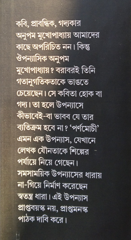কবি, প্রাবন্ধিক, গদ্যকার অনুপম মুখোপাধ্যায় আমাদের কাছে অপরিচিত নন। কিন্তু ঔপন্যাসিক অনুপম মুখোপাধ্যায়? বরাবরই তিনি গতানুগতিকতাকে ভাঙতে চেয়েছেন। সে কবিতা হোক বা গদ্য। তা হলে উপন্যাসে কীভাবেই-বা ভাবব যে তার ব্যতিক্রম হবে না? 'পর্ণমোচী' এমন এক উপন্যাস, যেখানে লেখক যৌনতাকে শিল্পের পর্যায়ে নিয়ে গেছেন।