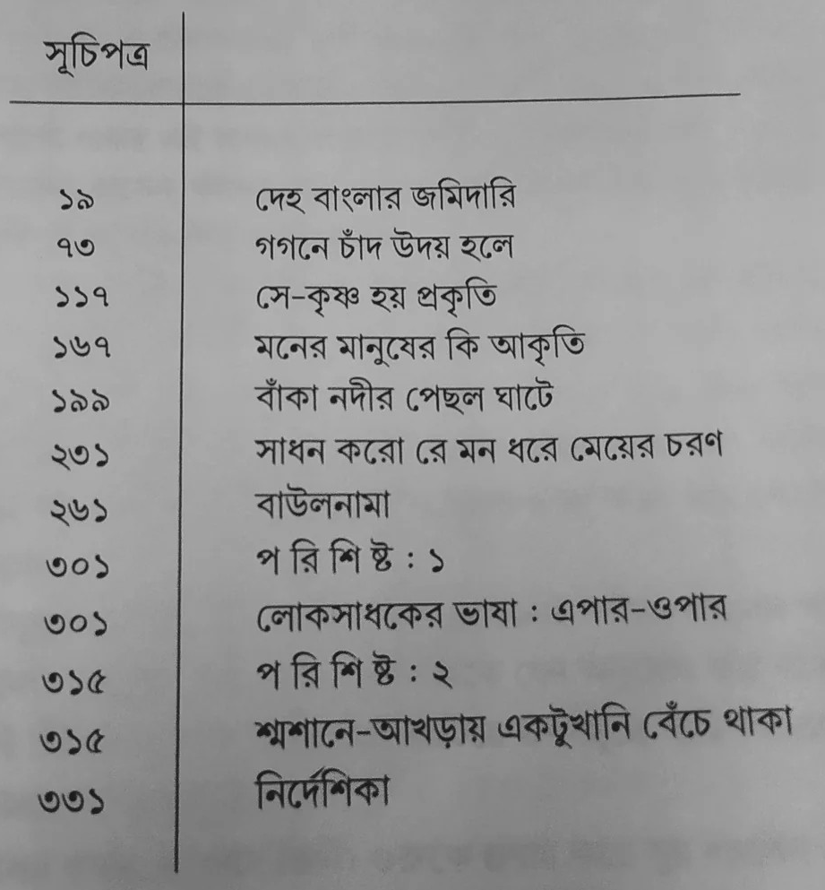নদিয়া, মুর্শিদাবাদ, বর্ধমান, বাঁকুড়া, বীরভূমসহ পশ্চিমবঙ্গের বিভিন্ন অঞ্চলে বাউলের সাধনা, আচার, জীবনপ্রবাহটা আসলে কেমন- আখড়ায় গুরু-মুর্শিদে দীক্ষা পেয়ে সঙ্গিনী বা বাউলনির সহায়তায় কীভাবে এই যুগলভজনা, কায়াবাদী সাধনা দাঁড়িয়ে আছে মাথা তুলে স্বমহিমায়, তারই পুঙ্খানুপুঙ্খ বৃত্তান্ত ছড়িয়ে রয়েছে এই বইটির সাতটি রচনায়। আর "আমার কথা'য় লেখক নিজেই জানিয়েছেন দীর্ঘ ষোলো বছর ধরে এইসব তথাকথিত উচ্চকোটির সংস্কৃতির বাইরে দাঁড়ানো প্রান্তিক সাধনার সঙ্গে তাঁর জীবনকাহিনি জড়িয়ে যাওয়ার বৃত্তান্তটাও। সব মিলিয়ে এই বইতে উঠে এসেছে বাউল তথা দেহবাদী আচরণকলার সরব বৃত্তান্ত। সাধনা, স্খলন, ব্যভিচার, আশা, প্রেম, নারীর অবস্থান, যৌনবিকৃতি – সবই এখানে মূর্ত হয়েছে লেখকের আখড়াবাসের সুদীর্ঘ অভিজ্ঞতায়। এই বই পশ্চিমবঙ্গের বাউল তথা লোকালয় সাধনারই এক প্রামাণ্য দর্পণ।