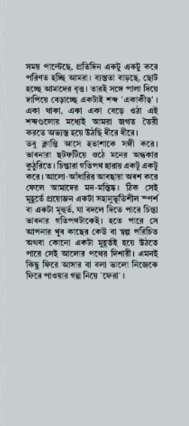 খুব কাছের কেউ বা স্বল্প পরিচিত অথবা কোনো একটা মুহূর্তই হয়ে উঠতে পারে সেই আলোর পথের দিশারী। এমনই কিছু ফিরে আসার বা বলা ভালো নিজেকে ফিরে পাওয়ার গল্প নিয়ে 'ফেরা'।