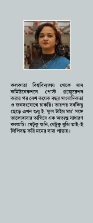 কলকাতা বিশ্ববিদ্যালয় থেকে মাস কমিউনেকশনে পোস্ট গ্র্যাজুয়েশন করার পর বেশ কয়েক বছর সাংবাদিকতা ও জনসংযোগে চাকরি। তারপর সবকিছু ছেড়ে এখন শুধু ই 'ফুল টাইম মম' সঙ্গে ভালোবাসার তাগিদে এক অত্যন্ত সাধারণ কলমচি। যেটুকু শুনি, যেটুকু বুঝি তাই-ইলিপিবদ্ধ করি মনের সাদা পাতায়।