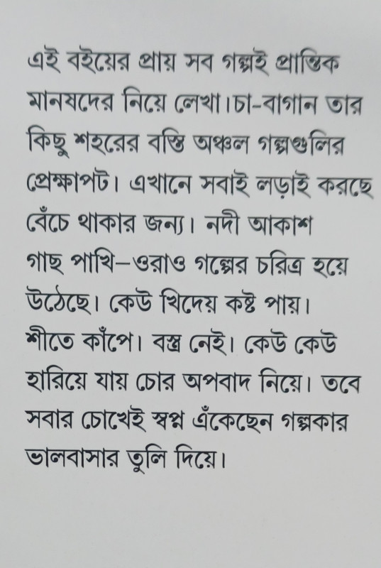 এই বইয়ের প্রায় সব গল্পই প্রান্তিক মানষদের নিয়ে লেখা। চা-বাগান তার কিছু শহরের বস্তি অঞ্চল গল্পগুলির প্রেক্ষাপট। এখানে সবাই লড়াই করছে বেঁচে থাকার জন্য। নদী আকাশ গাছ পাখি-ওরাও গল্পের চরিত্র হয়ে উঠেছে। কেউ খিদেয় কষ্ট পায়। শীতে কাঁপে। বস্ত্র নেই। কেউ কেউ হারিয়ে যায় চোর অপবাদ নিয়ে। তবে সবার চোখেই স্বপ্ন এঁকেছেন গল্পকার ভালবাসার তুলি দিয়ে।