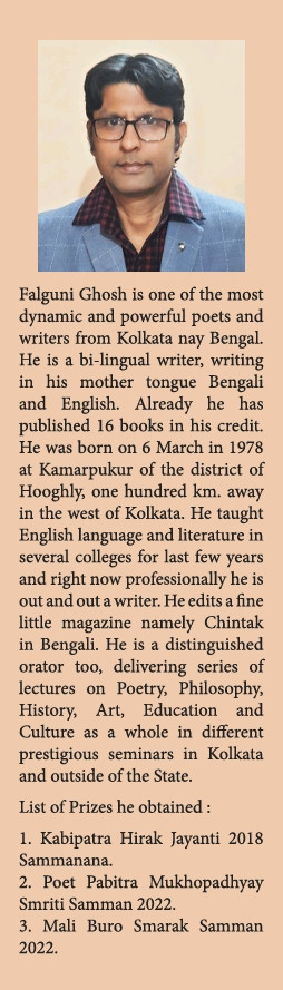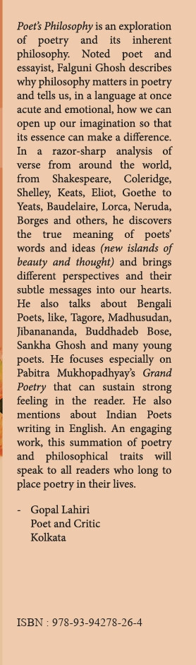 Poet's Philosophy is an exploration of poetry and its inherent philosophy. Noted poet and essayist, Falguni Ghosh describes why philosophy matters in poetry and tells us, in a language at once acute and emotional, how we can open up our imagination so that its essence can make a difference. In a razor-sharp analysis of verse from around the world, from Shakespeare, Coleridge, Shelley, Keats, Eliot, Goethe to Yeats, Baudelaire, Lorca, Neruda, Borges and others, he discovers the true meaning of poets' words and ideas (new islands of beauty and thought) and brings different perspectives and their subtle messages into our hearts. He also talks about Bengali Poets, like, Tagore, Madhusudan, Jibanananda, Buddhadeb Bose, Sankha Ghosh and many young poets. He focuses especially on Pabitra Mukhopadhyay's Grand Poetry that can sustain strong feeling in the reader. He also mentions about Indian Poets writing in English. An engaging work, this summation of poetry and philosophical traits will speak to all readers who long to place poetry in their lives.