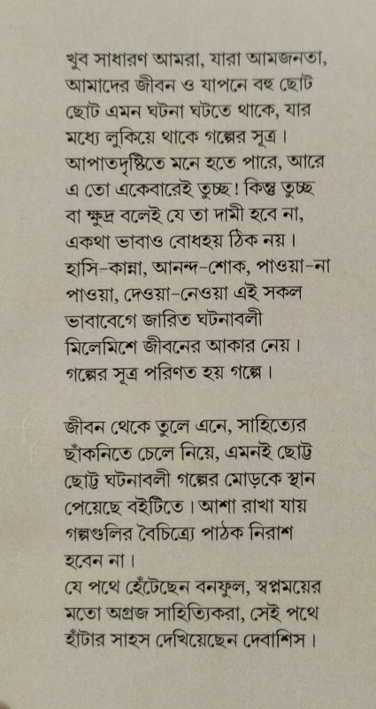 খুব সাধারণ আমরা, যারা আমজনতা, আমাদের জীবন ও যাপনে বহু ছোট ছোট এমন ঘটনা ঘটতে থাকে, যার মধ্যে লুকিয়ে থাকে গল্পের সূত্র। আপাতদৃষ্টিতে মনে হতে পারে, আরে এ তো একেবারেই তুচ্ছ! কিন্তু তুচ্ছ বা ক্ষুদ্র বলেই যে তা দামী হবে না, একথা ভাবাও বোধহয় ঠিক নয়। হাসি- কান্না, আনন্দ- শোক, পাওয়া - না পাওয়া, দেওয়া - নেওয়া এই সকল ভাবাবেগে জারিত ঘটনাবলী মিলেমিশে জীবনের আকার নেয়। গল্পের সূত্র পরিণত হয় গল্পে। জীবন থেকে তুলে এনে, সাহিত্যের ছাঁকনিতে চেলে নিয়ে, এমনই ছোট্ট ছোট্ট ঘটনাবলী গল্পের মোড়কে স্থান পেয়েছে বইটিতে। আশা রাখা যায় গল্পগুলির বৈচিত্র্যে পাঠক নিরাশ হবেন না। যে পথে হেঁটেছেন বনফুল, স্বপ্নময়ের মতো অগ্রজ সাহিত্যিকরা, সেই পথে হাঁটার সাহস দেখিয়েছেন দেবাশিস। বাকী কথা পাঠক এবং সময় বলবে।