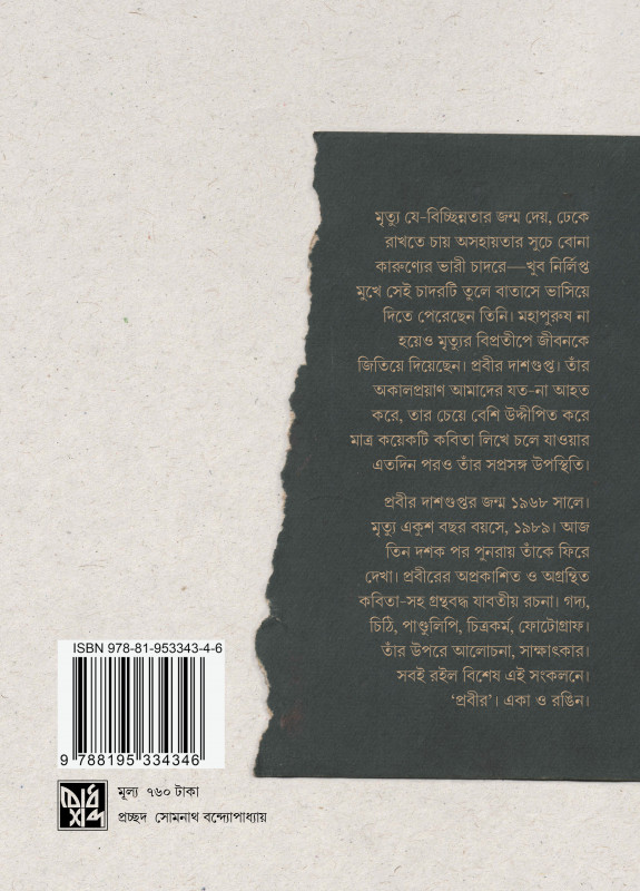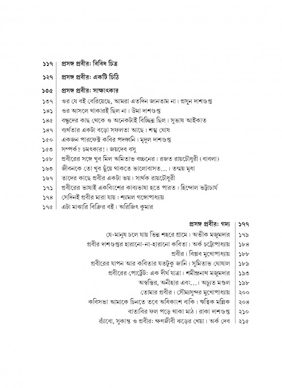 প্রবীর দাশগুপ্তর জন্ম ১৯৬৮ সালে। মৃত্যু একুশ বছর বয়সে, ১৯৮৯। আজ তিন দশক পর পুনরায় তাঁকে ফিরে দেখা। প্রবীরের অপ্রকাশিত ও অগ্রন্থিত কবিতা‑সহ গ্রন্থবদ্ধ যাবতীয় রচনা। গদ্য, চিঠি, পাণ্ডুলিপি, চিত্রকর্ম, ফোটোগ্রাফ। তাঁর উপরে আলোচনা, সাক্ষাৎকার। সবই রইল বিশেষ এই সংকলনে। ‘প্রবীর’। একা ও রঙিন।