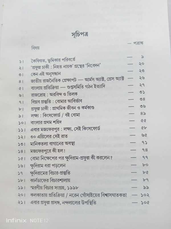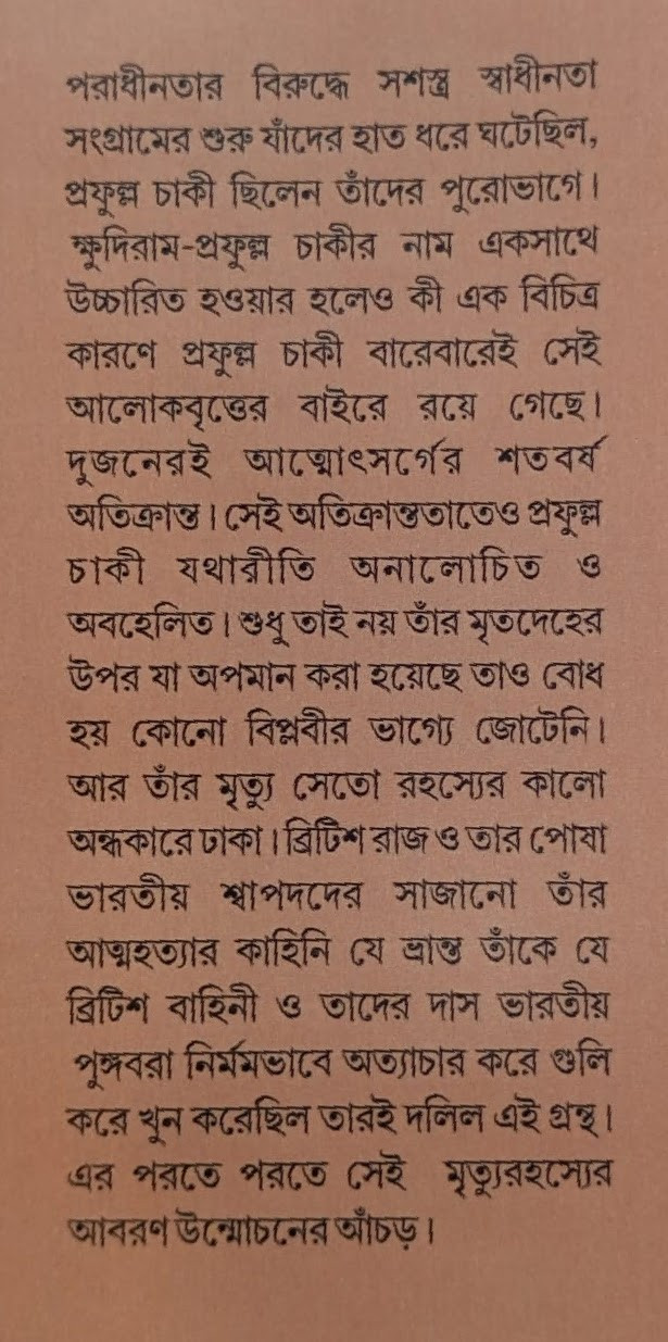 পরাধীনতার বিরুদ্ধে সশস্ত্র স্বাধীনতা সংগ্রামের শুরু যাঁদের হাত ধরে ঘটেছিল, প্রফুল্ল চাকী ছিলেন তাঁদের পুরোভাগে। ক্ষুদিরাম-প্রফুল্ল চাকীর নাম একসাথে উচ্চারিত হওয়ার হলেও কী এক বিচিত্র কারণে প্রফুল্ল চাকী বারেবারেই সেই আলোকবৃত্তের বাইরে রয়ে গেছে। দুজনেরই আত্মোৎসর্গের শতবর্ষ অতিক্রান্ত। সেই অতিক্রান্ততাতেও প্রফুল্ল চাকী যথারীতি অনালোচিত ও অবহেলিত। শুধু তাই নয় তাঁর মৃতদেহের উপর যা অপমান করা হয়েছে তাও বোধ হয় কোনো বিপ্লবীর ভাগ্যে জোটেনি। আর তাঁর মৃত্যু সেতো রহস্যের কালো অন্ধকারে ঢাকা। ব্রিটিশ রাজ ও তার পোষা ভারতীয় শ্বাপদদের সাজানো তাঁর আত্মহত্যার কাহিনি যে ভ্রান্ত তাঁকে যে ব্রিটিশ বাহিনী ও তাদের দাস ভারতীয় পুঙ্গবরা নির্মমভাবে অত্যাচার করে গুলি করে খুন করেছিল তারই দলিল এই গ্রন্থ। এর পরতে পরতে সেই মৃত্যুরহস্যের আবরণ উন্মোচনের আঁচড়।
