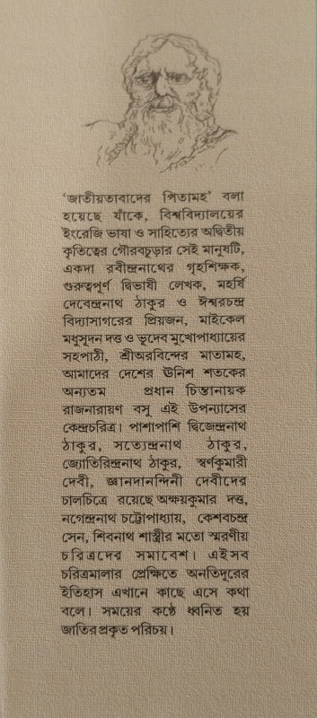 'জাতীয়তাবাদের পিতামহ' বলা হয়েছে যাঁকে, বিশ্ববিদ্যালয়ের ইংরেজি ভাষা ও সাহিত্যের অদ্বিতীয় কৃতিত্বের গৌরবচূড়ার সেই মানুষটি, একদা রবীন্দ্রনাথের গৃহশিক্ষক, গুরুত্বপূর্ণ দ্বিভাষী লেখক, মহর্ষি দেবেন্দ্রনাথ ঠাকুর ও ঈশ্বরচন্দ্র বিদ্যাসাগরের প্রিয়জন, মাইকেল মধুসূদন দত্ত ও ভূদেব মুখোপাধ্যায়ের সহপাঠী, শ্রীঅরবিন্দের মাতামহ, আমাদের দেশের উনিশ শতকের অন্যতম প্রধান চিন্তানায়ক রাজনারায়ণ বসু এই উপন্যাসের কেন্দ্রচরিত্র। পাশাপাশি দ্বিজেন্দ্রনাথ ঠাকুর, সত্যেন্দ্রনাথ ঠাকুর, জ্যোতিরিন্দ্রনাথ ঠাকুর, স্বর্ণকুমারী দেবী, জ্ঞানদানন্দিনী দেবীদের চালচিত্রে রয়েছে অক্ষয়কুমার দত্ত, নগেন্দ্রনাথ চট্টোপাধ্যায়, কেশবচন্দ্র সেন, শিবনাথ শাস্ত্রীর মতো স্মরণীয় চরিত্রদের সমাবেশ। এইসব চরিত্রমালার প্রেক্ষিতে অনতিদূরের ইতিহাস এখানে কাছে এসে কথা বলে। সময়ের কণ্ঠে ধ্বনিত হয় জাতির প্রকৃত পরিচয়।