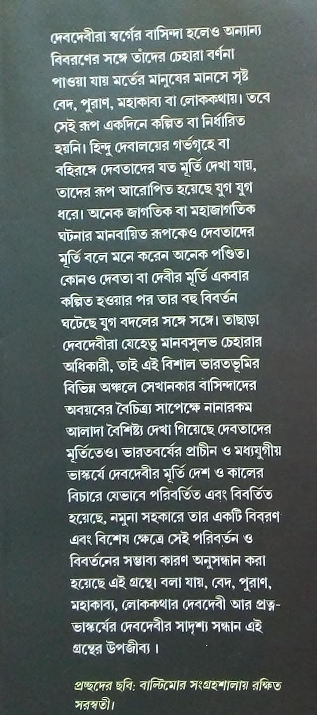 দেবদেবীরা স্বর্গের বাসিন্দা হলেও অন্যান্য বিবরণের সঙ্গে তাঁদের চেহারা বর্ণনা পাওয়া যায় মর্তের মানুষের মানসে সৃষ্ট বেদ, পুরাণ, মহাকাব্য বা লোককথায়। তবে সেই রূপ একদিনে কল্পিত বা নির্ধারিত হয়নি। হিন্দু দেবালয়ের গর্ভগৃহে বা বহিরঙ্গে দেবতাদের যত মূর্তি দেখা যায়, তাদের রূপ আরোপিত হয়েছে যুগ যুগ ধরে। অনেক জাগতিক বা মহাজাগতিক ঘটনার মানবায়িত রূপকেও দেবতাদের মূর্তি বলে মনে করেন অনেক পণ্ডিত। কোনও দেবতা বা দেবীর মূর্তি একবার কল্পিত হওয়ার পর তার বহু বিবর্তন ঘটেছে যুগ বদলের সঙ্গে সঙ্গে। তাছাড়া দেবদেবীরা যেহেতু মানবসুলভ চেহারার অধিকারী, তাই এই বিশাল ভারতভূমির বিভিন্ন অঞ্চলে সেখানকার বাসিন্দাদের অবয়বের বৈচিত্র্য সাপেক্ষে নানারকম আলাদা বৈশিষ্ট্য দেখা গিয়েছে দেবতাদের মূর্তিতেও। ভারতবর্ষের প্রাচীন ও মধ্যযুগীয় ভাস্কর্যে দেবদেবীর মূর্তি দেশ ও কালের বিচারে যেভাবে পরিবর্তিত এবং বিবর্তিত হয়েছে, নমুনা সহকারে তার একটি বিবরণ এবং বিশেষ ক্ষেত্রে সেই পরিবর্তন ও বিবর্তনের সম্ভাব্য কারণ অনুসন্ধান করা হয়েছে এই গ্রন্থে। বলা যায়, বেদ, পুরাণ, মহাকাব্য, লোককথার দেবদেবী আর প্রত্ন- ভাস্কর্যের দেবদেবীর সাদৃশ্য সন্ধান এই গ্রন্থের উপজীব্য।