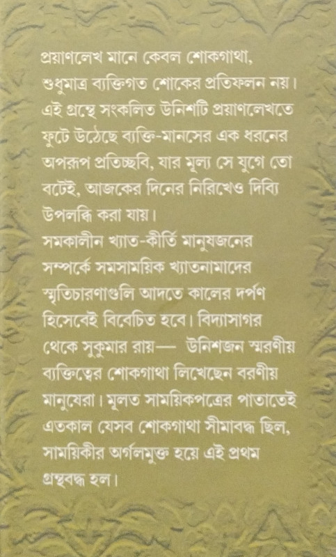 প্রয়াণলেখ মানে কেবল শোকগাথা, শুধুমাত্র ব্যক্তিগত শোকের প্রতিফলন নয়। এই গ্রন্থে সংকলিত উনিশটি প্রয়াণলেখতে ফুটে উঠেছে ব্যক্তি-মানসের এক ধরনের অপরূপ প্রতিচ্ছবি, যার মূল্য সে যুগে তো বটেই, আজকের দিনের নিরিখেও দিব্যি উপলব্ধি করা যায়।