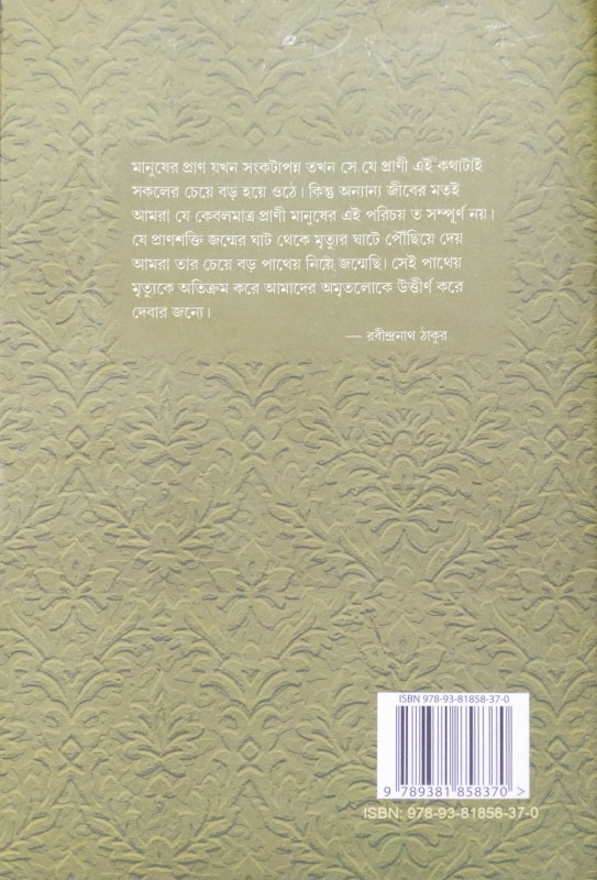 "মানুষের প্রাণ যখন সংকটাপন্ন তখন সে যে প্রাণী এই কথাটাই সকলের চেয়ে বড় হয়ে ওঠে। কিন্তু অন্যান্য জীবের মতই আমরা যে কেবলমাত্র প্রাণী মানুষের এই পরিচয় ত সম্পূর্ণ নয়। যে প্রাণশক্তি জন্মের ঘাট থেকে মৃত্যুর ঘাটে পৌঁছিয়ে দেয় আমরা তার চেয়ে বড় পাথেয় নিচ্ছে জন্মেছি। সেই পাথেয় মৃত্যুকে অতিক্রম করে আমাদের অমৃতলোকে উত্তীর্ণ করে দেবার জন্যে"।--