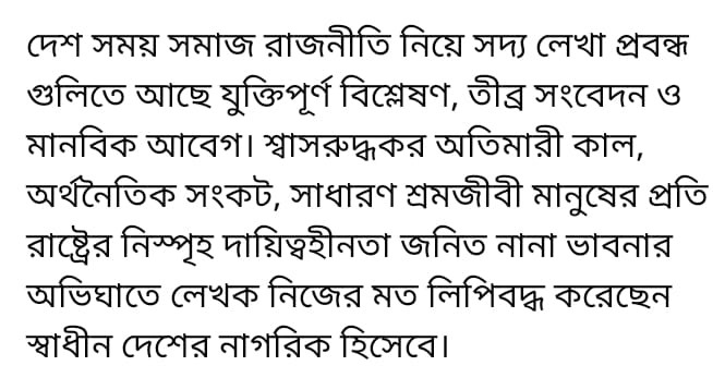 দেশ সময় সমাজ রাজনীতি নিয়ে সদ্য লেখা প্রবন্ধ গুলিতে আছে যুক্তিপূর্ণ বিশ্লেষণ, তীব্র সংবেদন ও মানবিক আবেগ। শ্বাসরুদ্ধকর অতিমারী কাল, অর্থনৈতিক সংকট, সাধারণ শ্রমজীবী মানুষের প্রতি রাষ্ট্রের নিস্পৃহ দায়িত্বহীনতা জনিত নানা ভাবনার অভিঘাতে লেখক নিজের মত লিপিবদ্ধ করেছেন স্বাধীন দেশের নাগরিক হিসেবে।