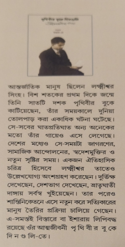 আন্তর্জাতিক মানুষ ছিলেন লক্ষ্মীশ্বর সিংহ। বিশ শতকের প্রথম দিকে জন্মে তিনি সাতটি দশক পৃথিবীর বুকে কাটিয়েছেন, তাঁর সময়কালে দুনিয়া তোলপাড় করা একাধিক ঘটনা ঘটেছে। সে-সবের ঘাতপ্রতিঘাত অন্য অনেকের মতো তাঁর গায়েও এসে লেগেছে। দেশের মধ্যেও সে-সময়টা জাগরণের, সামাজিক আন্দোলনের, স্বদেশমুক্তির ও নতুন সৃষ্টির সময়। একজন ঐতিহাসিক চরিত্র হিসেবে লক্ষ্মীশ্বর তাতেও উল্লেখযোগ্য অংশগ্রহণ করেছেন। দুর্ভিক্ষ দেখেছেন, দেশভাগ দেখেছেন, ভ্রাতৃঘাতী দাঙ্গায় সর্বস্ব খুইয়েছেন। তার পরেও শান্তিনিকেতনে এসে নতুন করে সত্যিকারের মানুষ তৈরির প্রক্রিয়া চালিয়ে গেছেন। এ-সমস্তই বিস্তারে বা ইশারায় লিপিবদ্ধ রয়েছে ওঁর আত্মজীবনী পৃথিবীর বুকে দিন গুলি-তে।