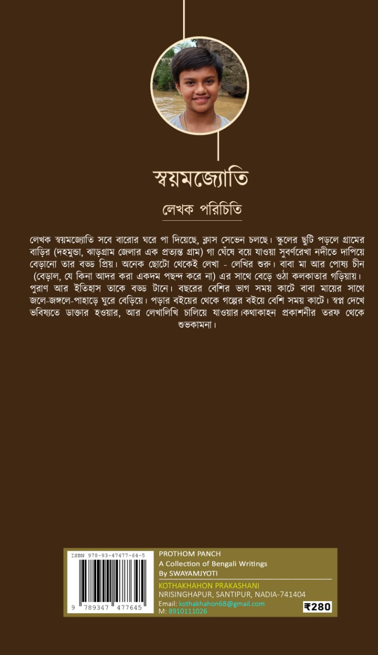 লেখক স্বয়মজ্যোতি সবে বারোর ঘরে পা দিয়েছে, ক্লাস সেভেন চলছে। স্কুলের ছুটি পড়লে গ্রামের বাড়ির (দহমুন্ডা, ঝাড়গ্রাম জেলার এক প্রত্যন্ত গ্রাম) গা ঘেঁষে বয়ে যাওয়া সুবর্ণরেখা নদীতে দাপিয়ে বেড়ানো তার বড্ড প্রিয়। অনেক ছোটো থেকেই লেখা লেখির শুরু। বাবা মা আর পোষ্য চীন (বেড়াল, যে কিনা আদর করা একদম পছন্দ করে না) এর সাথে বেড়ে ওঠা কলকাতার গড়িয়ায়। পুরাণ আর ইতিহাস তাকে বড্ড টানে। বছরের বেশির ভাগ সময় কাটে বাবা মায়ের সাথে জলে-জঙ্গলে-পাহাড়ে ঘুরে বেড়িয়ে। পড়ার বইয়ের থেকে গল্পের বইয়ে বেশি সময় কাটে। স্বপ্ন দেখে ভবিষ্যতে ডাক্তার হওয়ার, আর লেখালিখি চালিয়ে যাওয়ার।