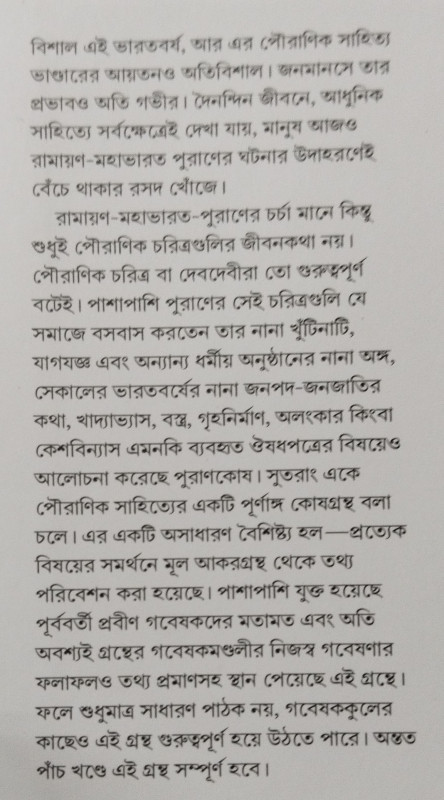 পৌরাণিক সাহিত্যের অসংখ্য চরিত্র, ঘটনা, স্থানের উৎস জানা কিন্তু অত সহজ নয়। অথচ হাতের কাছে নেই এমন কোনো কোষগ্রন্থ যা থেকে এক মুহূর্তে পাওয়া যেতে পারে তার হদিস। দীর্ঘ গবেষণার ফসল এই পুরাণকোষ সেই অভাব পূর্ণ করবে।